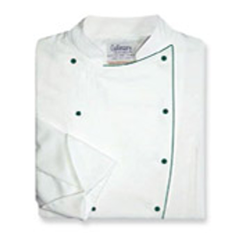 Women's Contempo Chef Coat White 65 Poly/35 Cotton Maxima Poplin Spruce stud buttons Spruce cording on front Back ties Princess seams Side slits Double breasted French cuffs Mandarin collar Made to Order Made in USA