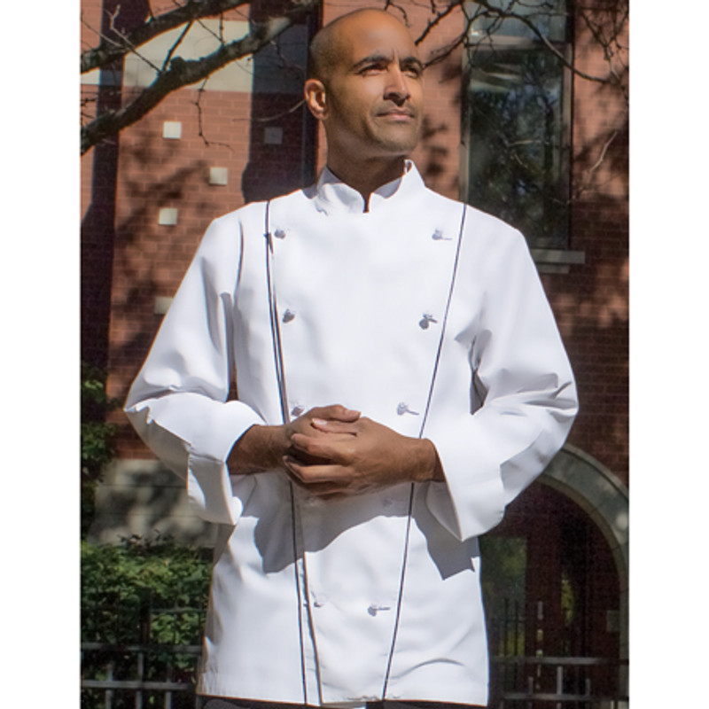 Your chef coat should be as unique as you; creating design is as easy as following the steps! This Chef coat is comes in White 65% Poly/35% Cotton Maxima Poplin Blend, double breasted styling with 10 white knot buttons, concealed left breast pocket, French cuffs, Mandarin collar, and your choice of front cording color! You take it from there!